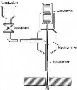 Nach dieser Saphirdüse wird dem Wasserstrahl in der Mischkammer das Abrasivmittel (Granatsand, Korund oder Olivin) beigemischt, welches durch das Wasser mitgerissen und beschleunigt wird.